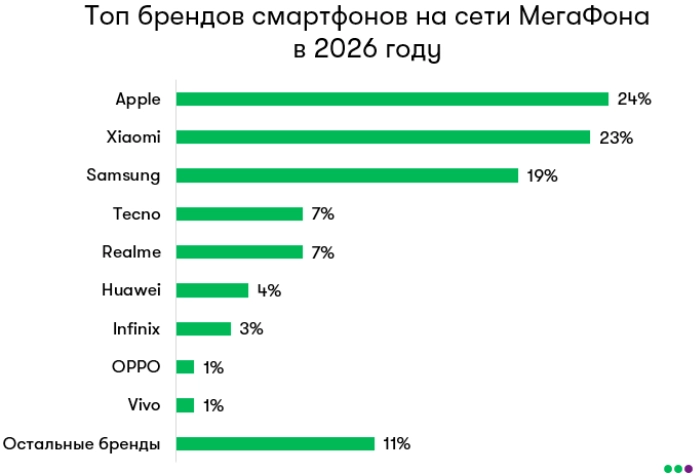 В 2026 году доля смартфонов Apple среди устройств, зарегистрированных в мобильной сети МегаФона, достигла 24%, сместив с первого места Xiaomi. В топе устройств по-прежнему остается iPhone 11. Среди Android-брендов уверенно растет популярность Tecno.
