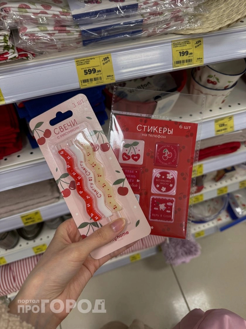 Вишнёвая тема продолжается в мелочах: на полке лежат волнистые свечи с вишёнками и набор наклеек‑стикеров в красно‑розовой гамме. Свечи можно использовать для сервировки праздничного стола или декора комнаты, а стикеры — наклеить на телефон, ноутбук, кухонные банки или органайзеры. Это быстрый способ «подружить» остальной интерьер с новой посудой: несколько наклеек и пара свечей делают композицию законченной, как будто всё подбиралось комплектом.