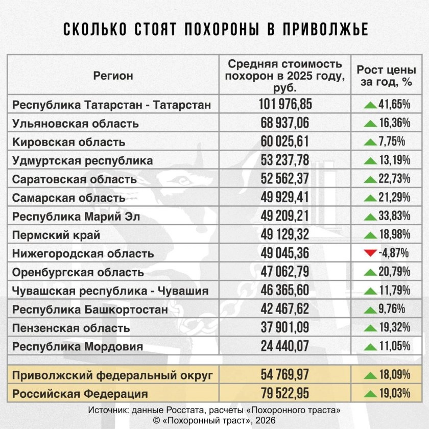 Самые дорогие похороны в округе — в Татарстане. Там средний чек достиг 101 976 рублей, показав резкий рост сразу на 41,65% за год. В числе регионов с высокими ценами также выделяются Ульяновская область (около 68,9 тыс. рублей) и Кировская область (60 тыс. рублей).