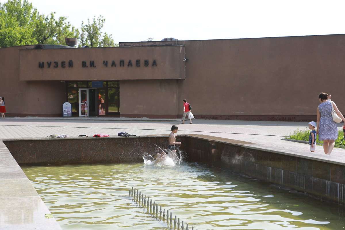 У фонтана в сквере имени В.И.Чапаева брызги приятно освежают тело. А местные сорванцы и вовсе залезли в бассейн. Так они решили сбить жару.
