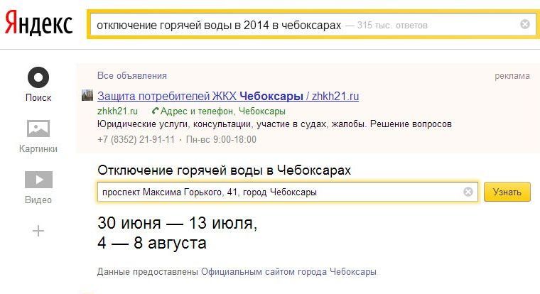 В поисковой системе «Яндекс» появился удобный ресурс с информацией о сроках отключения горячей воды в Чебоксарах. Теперь чебоксарцам не нужно ждать объявления на подъезде, вводить лишние запросы в Интернете, звонить в обслуживающие организации. Об этом сообщают на сатйе администарции Чебоксар.