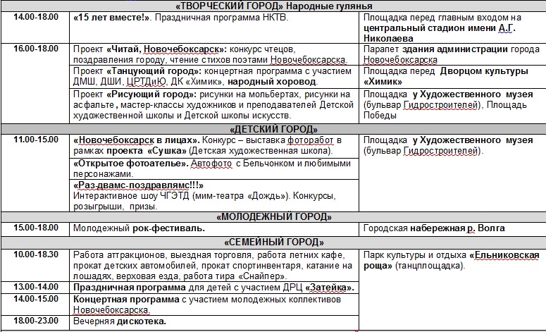 - В течения дня будут проводиться разные мероприятия "Спортивный город", "Город мастеров", "Творческий города", "Детский город", "Молодежный город", "Семейный город". Приятным сюрпризом станет выступление московской группы «Мистер Твистер», - сообщают в администрации города. - После этого на новочебоксарском небе зажгутся яркие огни - состоится праздничный фейерверк.