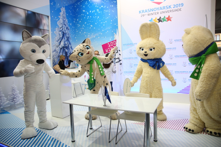 Под слоганом Real Winter (реальная зима) развернула свою работы презентация Зимней Универсиады - 2019, которая пройдет в городе Красноярск. Символ зимней Универсиады - ростовая кукла лайки, развлекала гостей на пару с символами прошедших Олимпийских игр в городе Сочи.