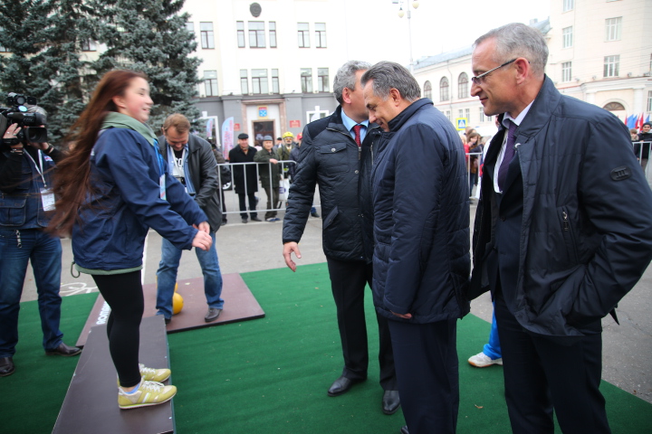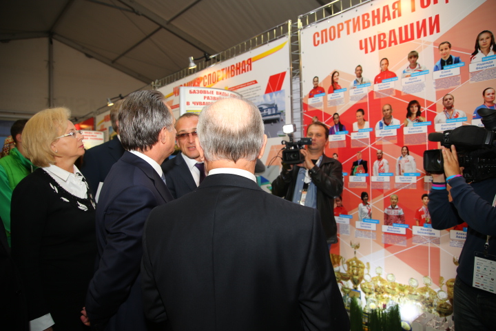 В сопровождении главы города Чебоксары Леонида Черкесова и министра спорта Чувашской Республики Сергея Мельникова, гости прошлись по основным площадкам выставки.