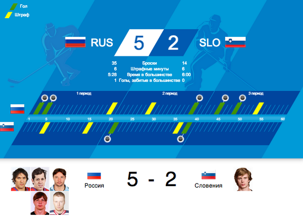 И... Мужская сборная России по хоккею выиграла первый матч у команды Словении со счетом 5:2.