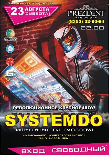 В субботу, 23 августа, в клубе «P'Rezident» Systemdo (Multi-Touch dj), Москва, 18+. Systemdo (Multi-Touch dj) - это лицо новой эры, музыкальное «киберпространство». Systemdo использует последние веяния в области сценического перфоманса. Футуристичный образ артиста создают эксклюзивные эквалайзерные, световые и лазерные элементы.