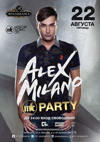 В пятницу, 22 августа, во Дворце развлечений «Ренессанс» dj Alex Milano (18+). Alex Milano - успешный dj & sound producer лейбла «Moscow Fucking City». Алекс начал свою карьеру в 2007 году, записав трек с вокалисткой клуба «Dяgilev». Его ремиксы и машапы играют все, а за его спиной - сотни городов и десяти стран.