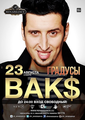 В субботу, 23 августа, Дворец развлечений «Ренессанс» представляет: dj Bak$ (группа «Градусы»), 18+. Легендарный солист, автор и исполнитель хитов группы «Градусы». Это тот самый dj Bak$, который известен всем как один из лучших r'n'b & mush up ди-джеев страны. Его неоднократно можно было увидеть у Busta Rhymes на разогреве и на вечеринках J.Lo! Главным преимуществом и сюрпризом для многих станет то, что Bak$ выступает вживую, исполняя свои легендарные хиты во время сета.