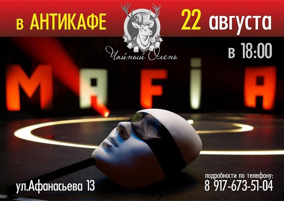В пятницу, 22 августа, в антикафе «Чайный олень» состоится большая игра в мафию. Культовая ролевая игра, которая позволяет игрокам развивать навыки общения, логики и интуиции.