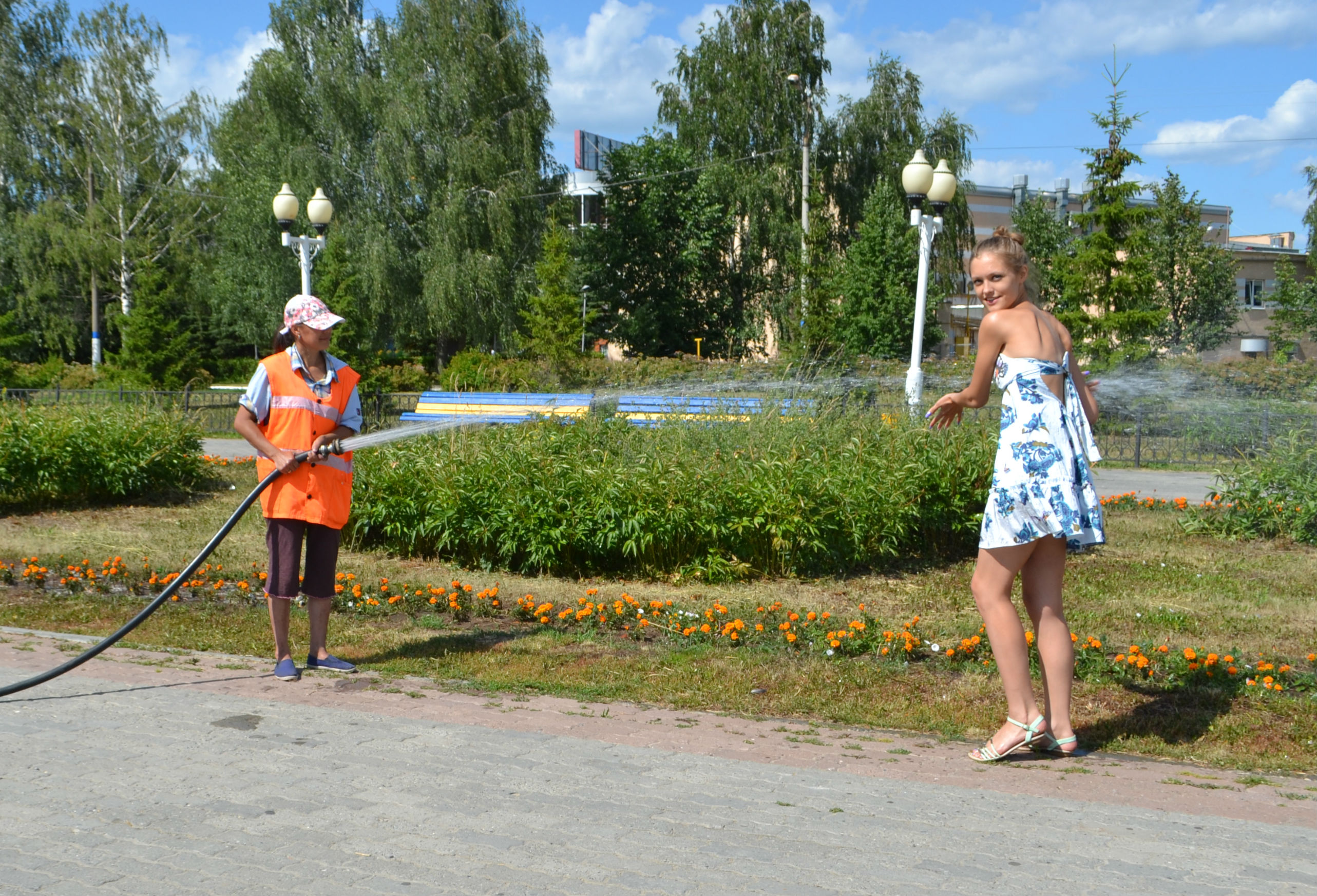 С наступлением летнего периода особенное внимание в городе уделяется зеленым насаждениям. Сначала их высаживают, а потом усиленнно поливают. В жаркую погоду цветы особенно нуждаются в воде, поэтому озеленители с помощью спецтехники поливают растения из огромных шлангов и разбрызгивателей. Увидели в жаркое время этих людей на улице? Попросите их облить вас и тогда вы мгновенно освежитесь!