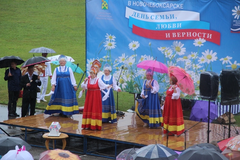 В Новочебоксарске состоялся праздничный концерт, посвященный Дню семьи, любви и верности. Несмотря на сильный дождь, новочебоксарцы приходили на праздник целыми семьями, участвовали в мастер-классах, посетили ярмарку, развлекались на творческих площадках, кушали уху и приняли участие в конкурсе на «самую-самую» коляску.