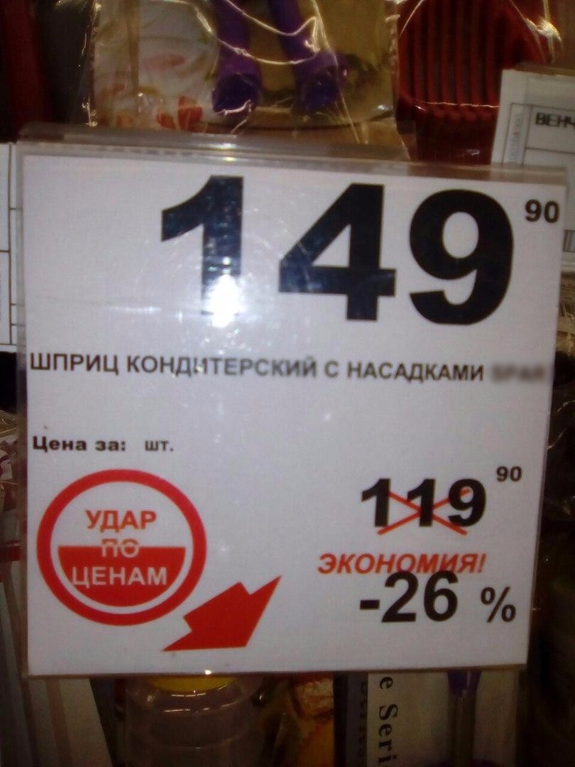 В Йошкар-Оле магазин на Патриаршей площади предлагает покупателям кондитерский шприц с необычной скидкой. На ценнике указана прежняя цена 119 рублей 90 копеек и нынешняя цена - 149 рублей 90 копеек. При этом указанная выгода составляет 26 процентов. Подробнее здесь.