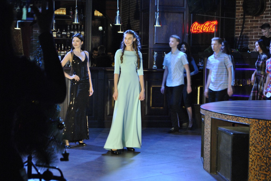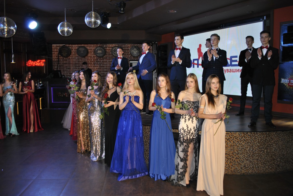 Следующий выход был в вечерних нарядах, на нем юноши подарили девушкам розы
