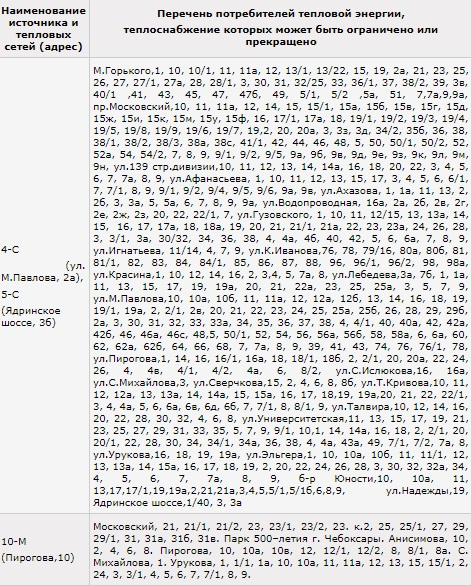 С 07:00 час. до 20:00 часов у следующих потребителей будет отключено теплоснабжение: