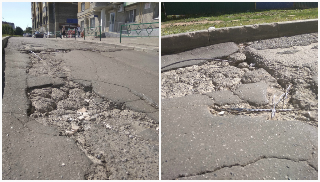 "Отвратительная дорога возле дома 7/8 по улице Тукташа в Благовещенском микрорайоне. Огромные ямы, из которых торчат куски арматуры. Рядом детский центр, детишки могут получить травму, а автомобили - повредить резину".