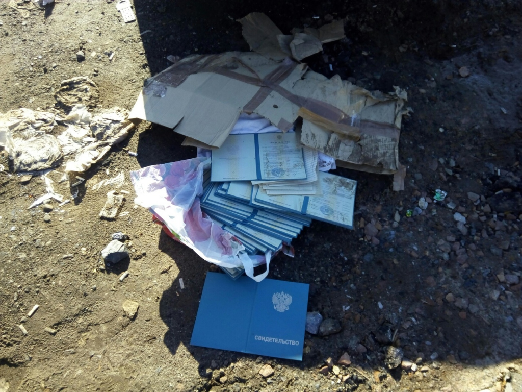 «Вышли из машины и заметили кучу свидетельств с печатями, пронумерованные, с указанием города. Явно им место не там, в грязи. Даже несмотря на 2011 год, указанный в документах. Нелепо, что кто-то решил просто выбросить эти свидетельства», - рассказал народный корреспондент.