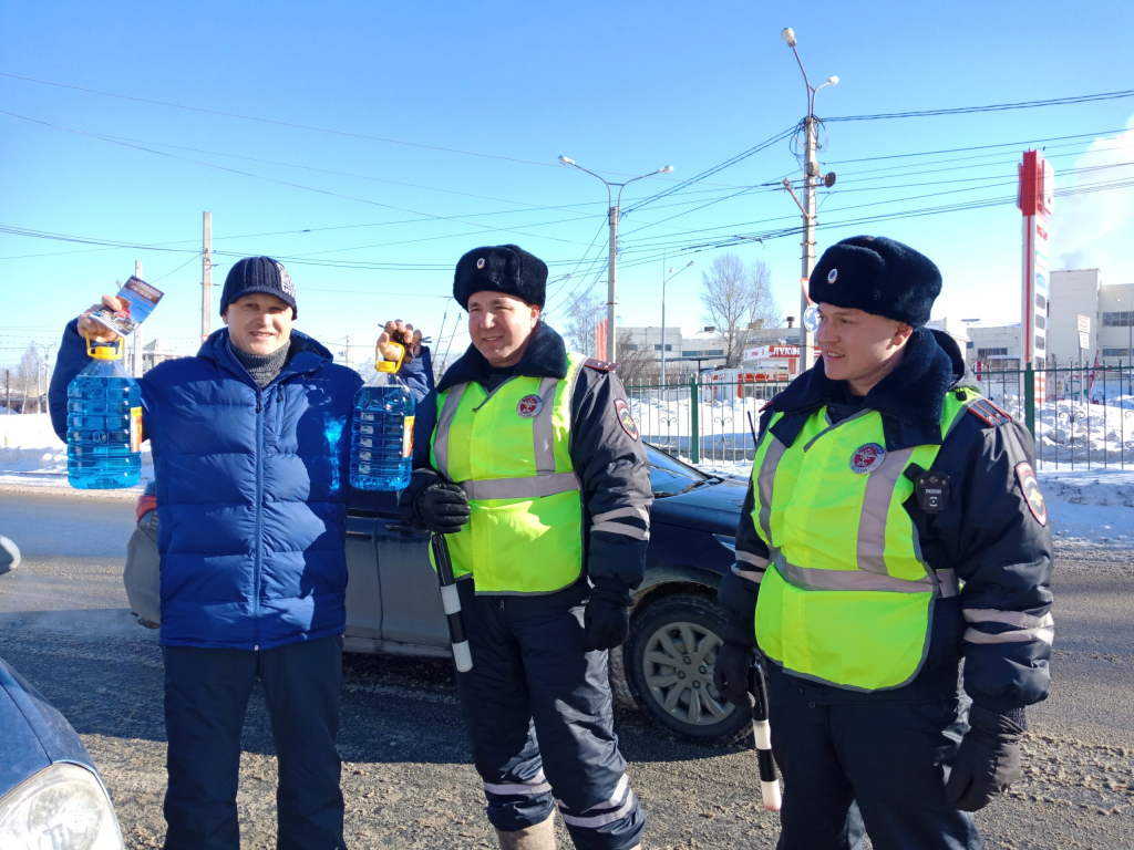 Увидев на проезжей части инспектора ДПС, водители были приятно удивлены, когда вместо законных требований предъявить для проверки документы, строгий страж порядка поздравлял, желал безопасных дорог и вручал очень нужный подарок – 4 литра «незамерзайки». Кстати, подготовить подарки помогли партнеры мероприятия: туристическая база «Солнышко» и кантри-отель «Березки».