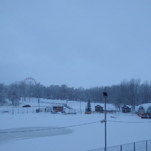 Гуляющих горожан в парке нет, а вот коммунальщики развернули бурную деятельность. Сотрудники "Зеленстроя" убирают мусор после празднования, техника чистит дорожки от снега.