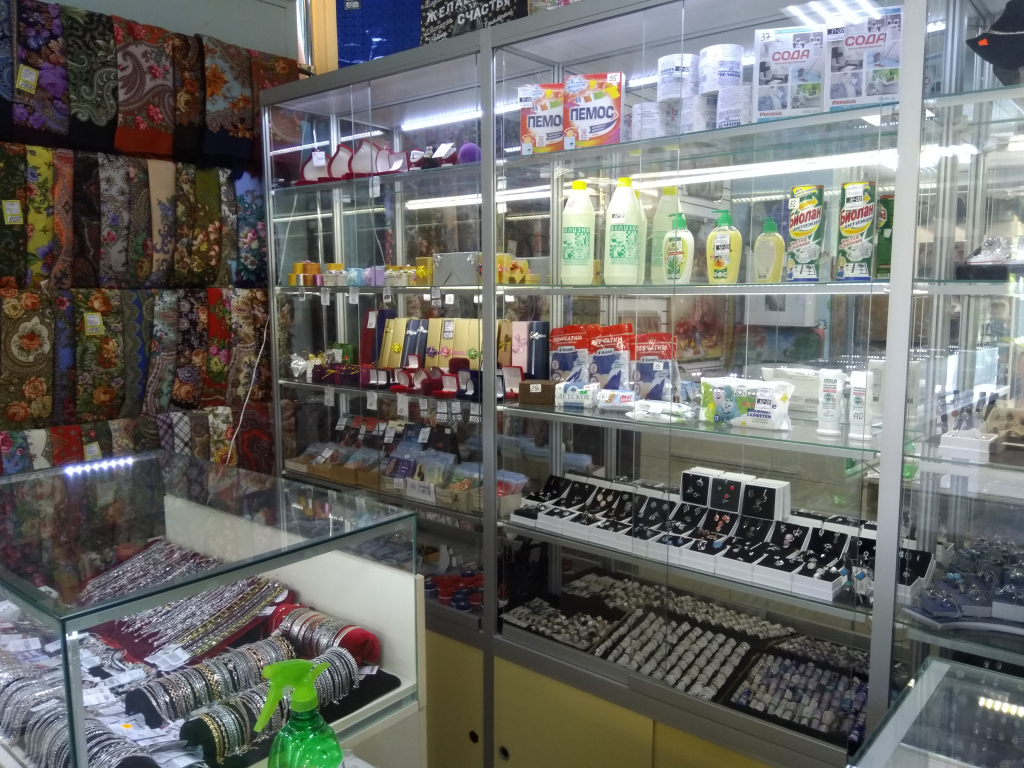 Первым из посещенных магазинов стал "Самоцвет". На входе в магазин присутствует табличка об обязательном ношении маски. Все отделы включили в свой ассортимент товары первой необходимости. К примеру, в ювелирном отделе начали продавать белизну, мыло, средство для очистки плиты и салфетки с масками.