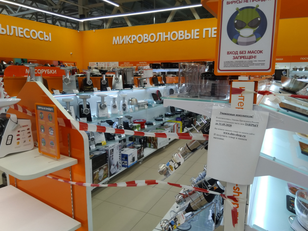Следующим объектом стал магазин электроники "ДНС" в здании бывшего супермаркета "Эссен". В магазин можно пройти только в маске, часть территории огорожена красной лентой, проход за которую закрыт. Товары, оказавшиеся за ограничительной лентой, можно получить по предзаказу. Остальная часть магазина открыта для свободного посещения. Продавец пояснил, с какой целью это сделано.