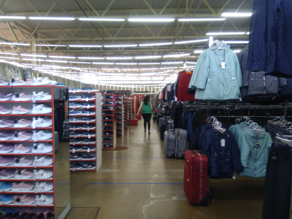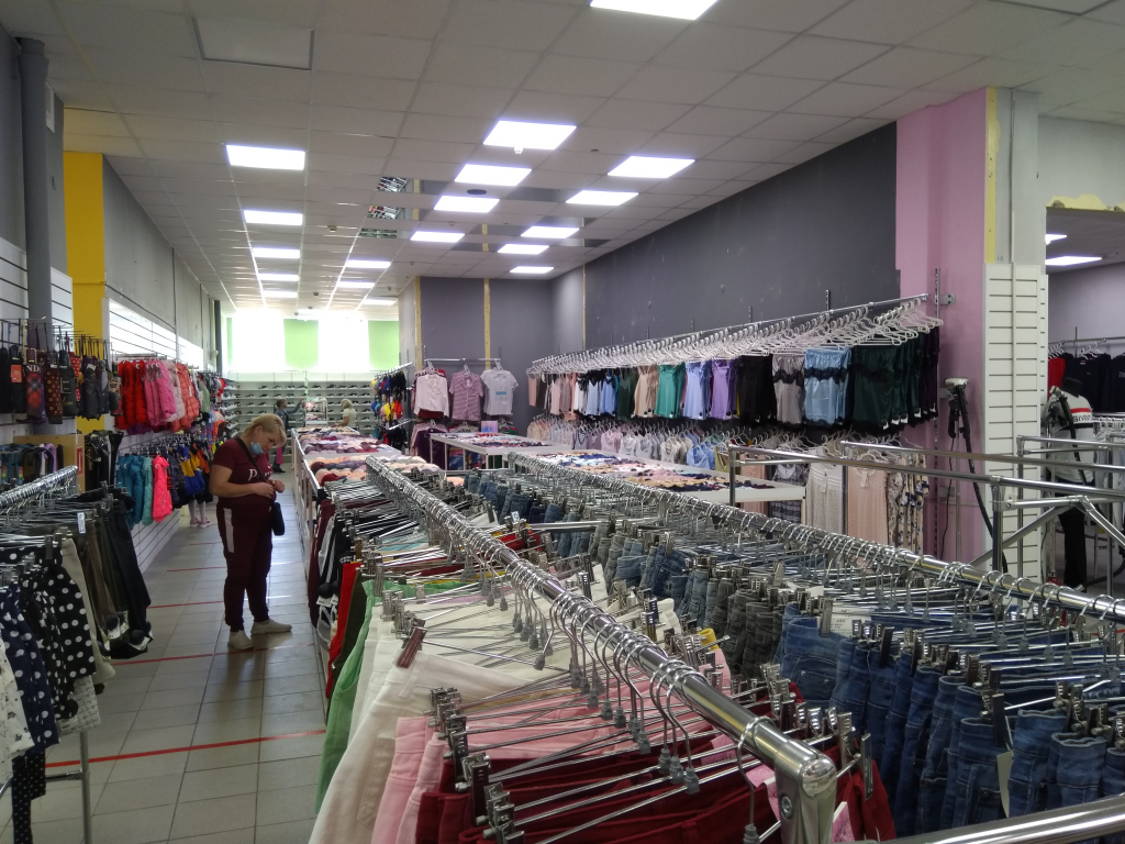 В этом же здании расположился крупный магазин одежды и обуви. На входе также имеются антисептики и предупреждение о ношение масок. Сотрудник, стоящий на дверях магазина, предупреждает покупателей о необходимости надевать маски. Многие могут свободно выбрать понравившийся товар. В данном случае контроль над посетителями не такой, как в небольших отделах. Некоторые из покупателей примеряют вещи и обувь. Однако дистанцию на кассе соблюдают.