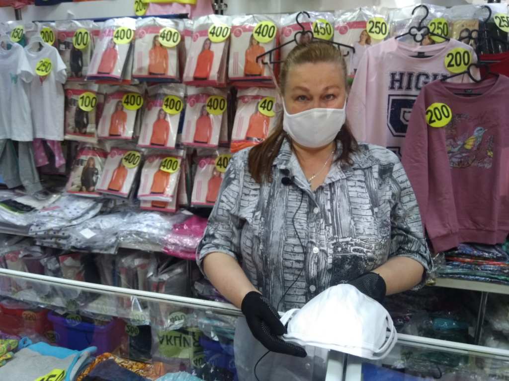 В этом же здании корреспондент посетил отдел одежды поменьше. Владелица торговой точки Ольга Репина говорит, что строго соблюдает все требования властей. У женщины весь товар огорожен, а потрогать понравившуюся вещь разрешается только после обработки рук антисептиком.