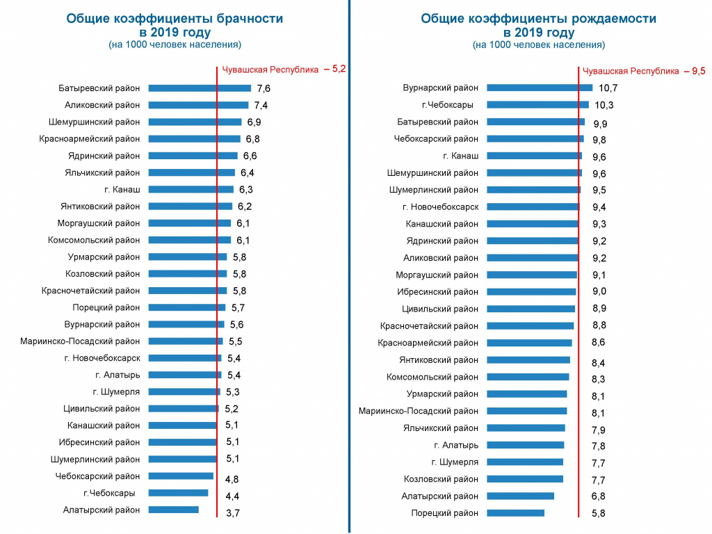 А в каких районах Чувашии больше или меньше всего пары заключали браки, а также где была рождаемость выше, а где ниже — в таблице Чувашстата: