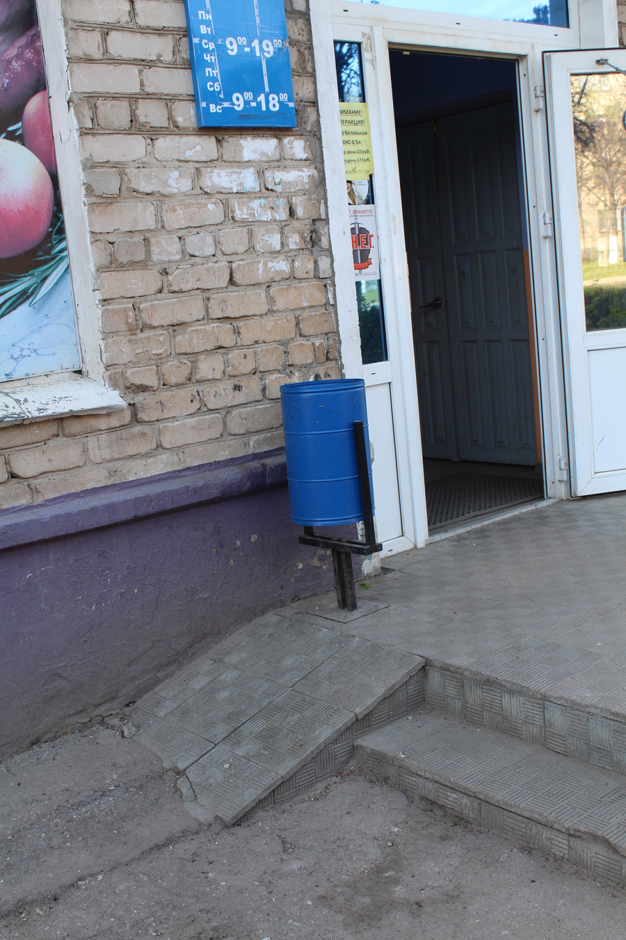 Так вход к магазину, который находится по адресу улица Николаева, 47 урна мешает войти во внутрь.