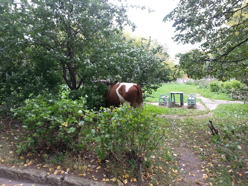 Один из дворов в Северо-Западном районе облюбовали коровы. Животные мирно паслись на радость местной детворе.