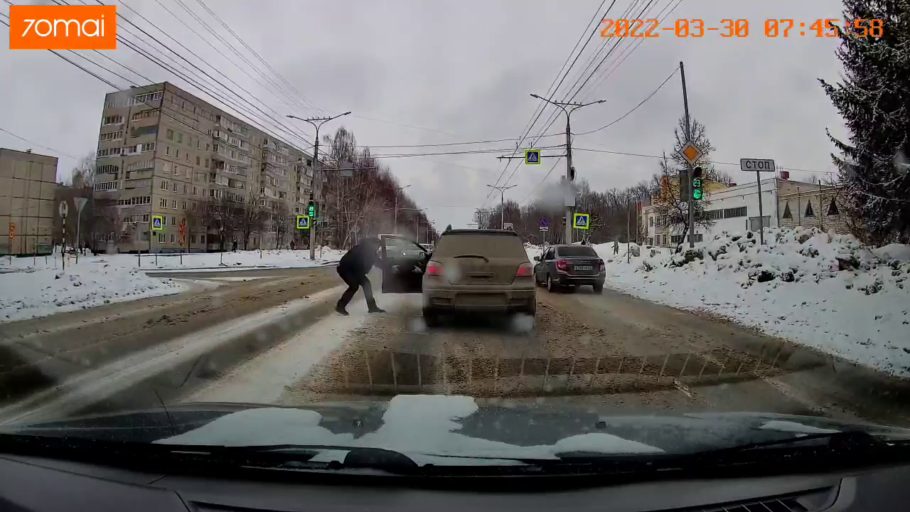 Второй водитель попытался уехать, но остановился. Напавший потянул мужчину за ногу. Тогда последний вышел, и оба принялись толкаться на проезжей части.