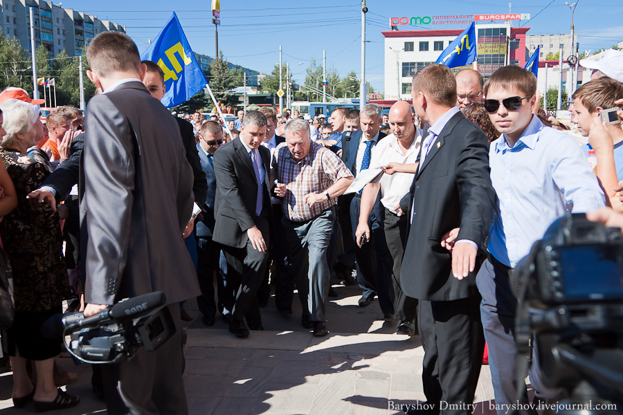 Первым делом Жириновский посетил вещевой рынок, где его моментально окружили горожане. Владимир Вольфович купил все арбузы в одной из палаток и раздал их, после чего покинул ярмарку.