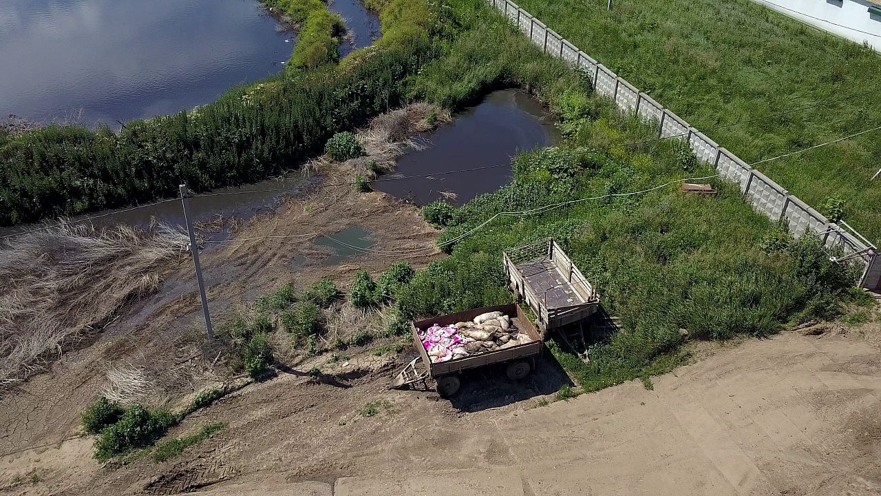 Также на кадры беспилотника попал прицеп, в кузове которого лежали трупы свиней. По мнению снявших видео, такое тоже недопустимо. По словам местных, запах разлагающихся трупов разносится по всей округе вперемешку с фекальным.