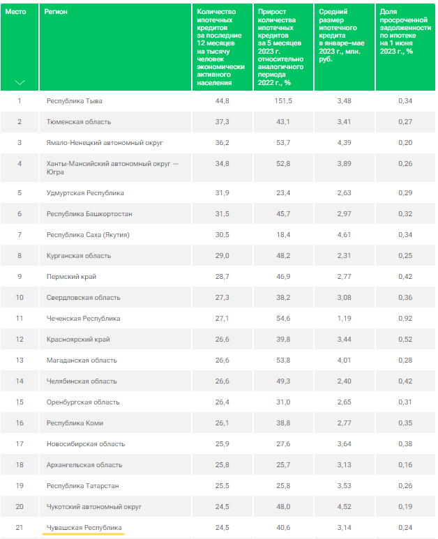 Большие кредиты берут в Московской области (5,4 миллиона рублей), в Санкт-Петербурге (5,1 миллиона рублей), а также в Якутии, на Чукотке и в Сахалинской области, где в среднем объем ипотеки составляет 4,5 миллиона рублей. В Чувашии же в среднем размер ипотечного кредита в январе-мае 2023 года составлял 3,14 миллиона рублей. Доля просроченной задолженности в республике 0,24 %.