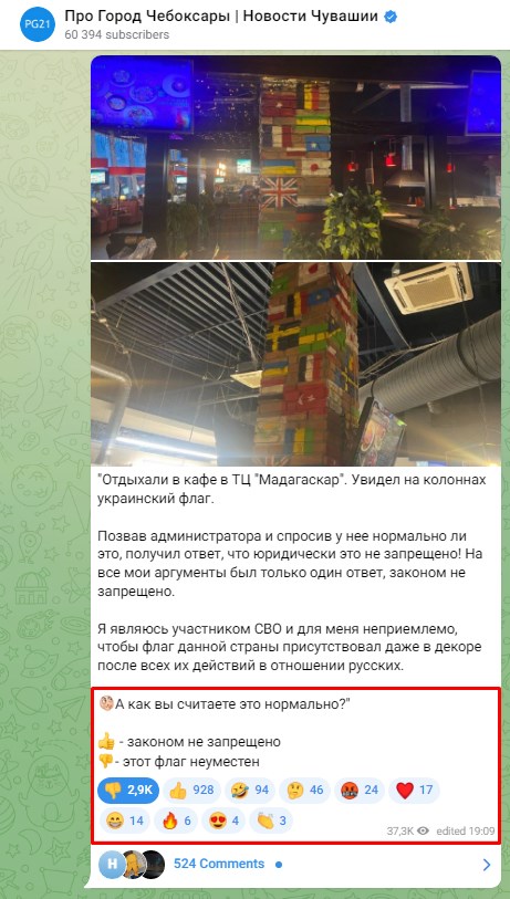 Напомним, 7 августа в "Про Город" вышел пост с обращением участника СВО. Мужчина отдыхал в кафе в ТЦ "Мадагаскар". В декоре заведения он заметил украинский флаг.