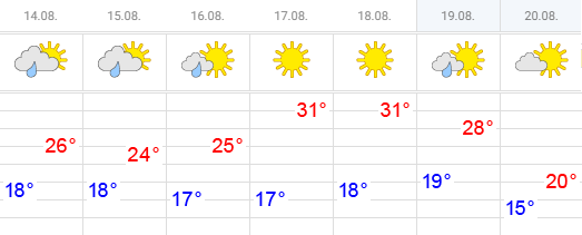 17 и 18 августа вновь станет жарко и солнечно. Столбики термометров по республике вновь поднимутся до 28-33 градусов. И только в выходные дни почувствуется похолодание. В дневные часы будет плюс 18-23, усилится северный ветер. В субботу местами пройдут кратковременные дожди, а в воскресенье, 20 августа, обойдется без осадков.