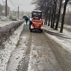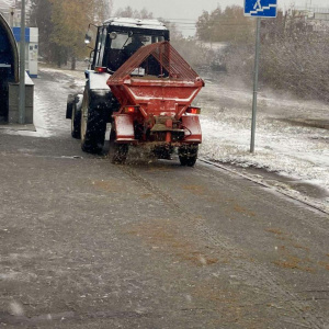 На тротуары вышли 25 тракторов. Они также обрабатывают асфальт бионордом или песчано-соляной смесью, после чего подметают.
