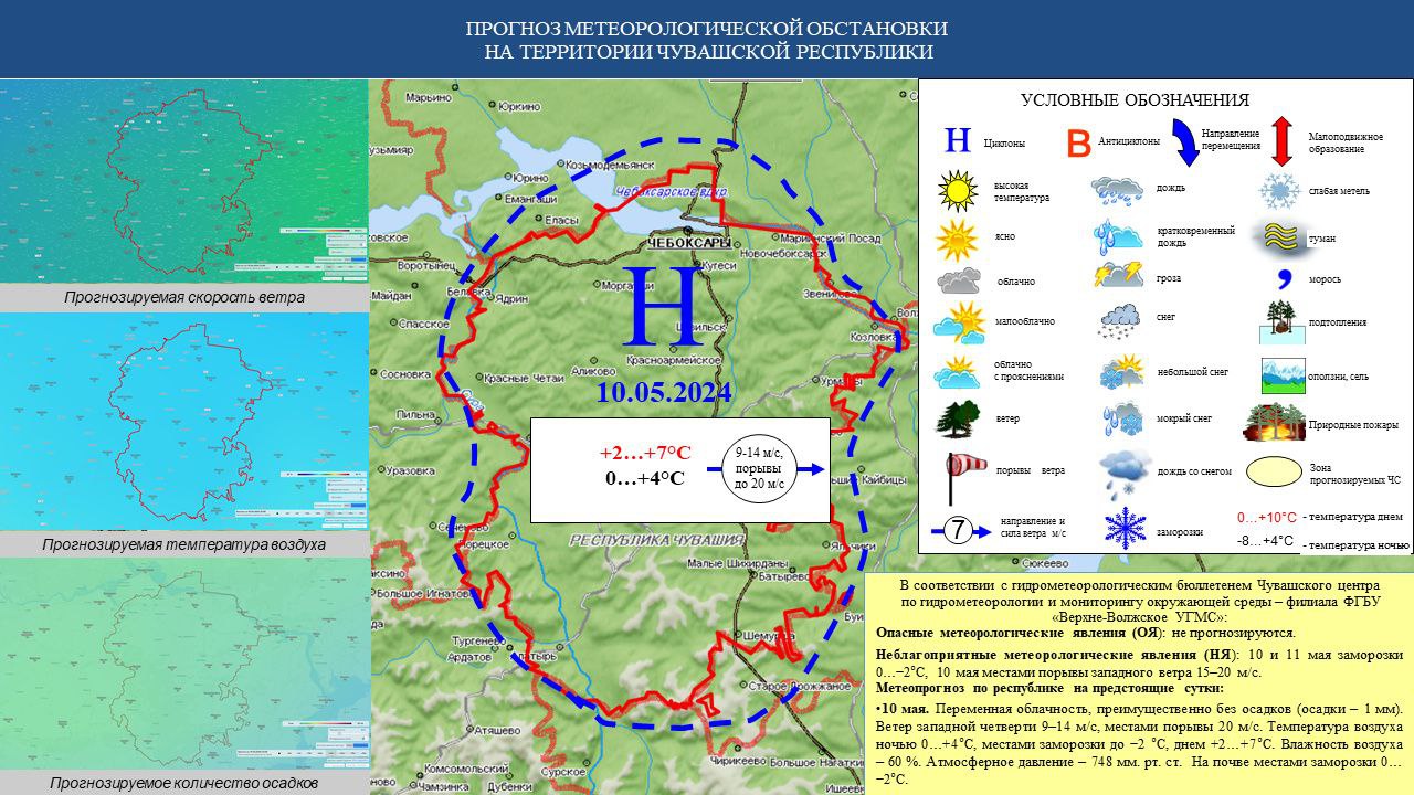 10 мая, по данным Чувашского центра по гидрометеорологии и мониторингу окружающей среды, жителей Чувашии ожидает облачная погода с прояснениями, небольшой дождь, в большинстве районов республики до одного миллиметра. Ветер западный, свежий, местами порывистый до штормового. Местами возможны заморозки на почве.
