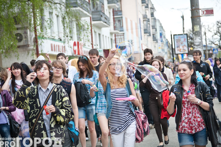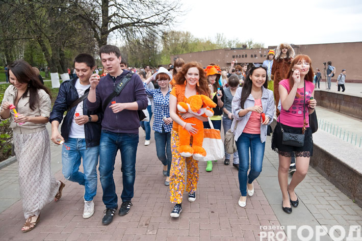 Более полутора тысяч молодых горожан, одетые в яркую одежду, с улыбками прошлись со сквера имени Чапаева до Чувашского драматического театра на Заливе, пуская в воздух тысячи и тысячи мыльных пузырей.